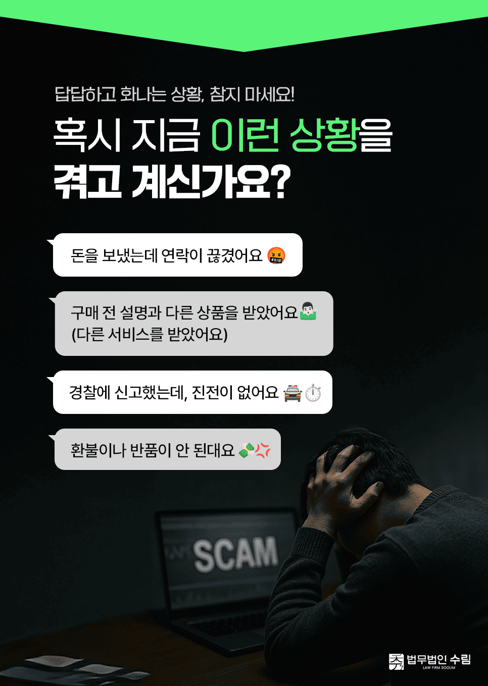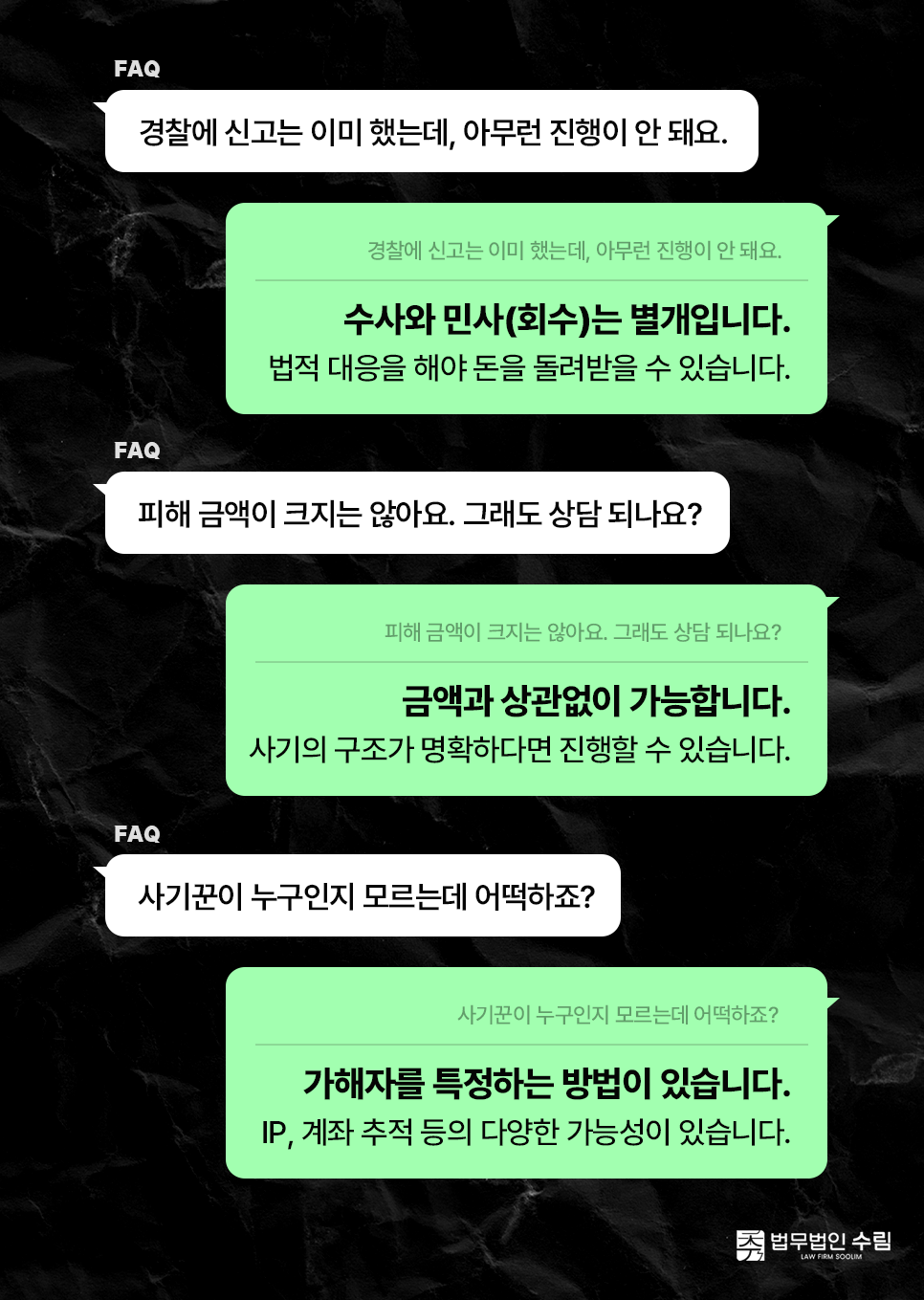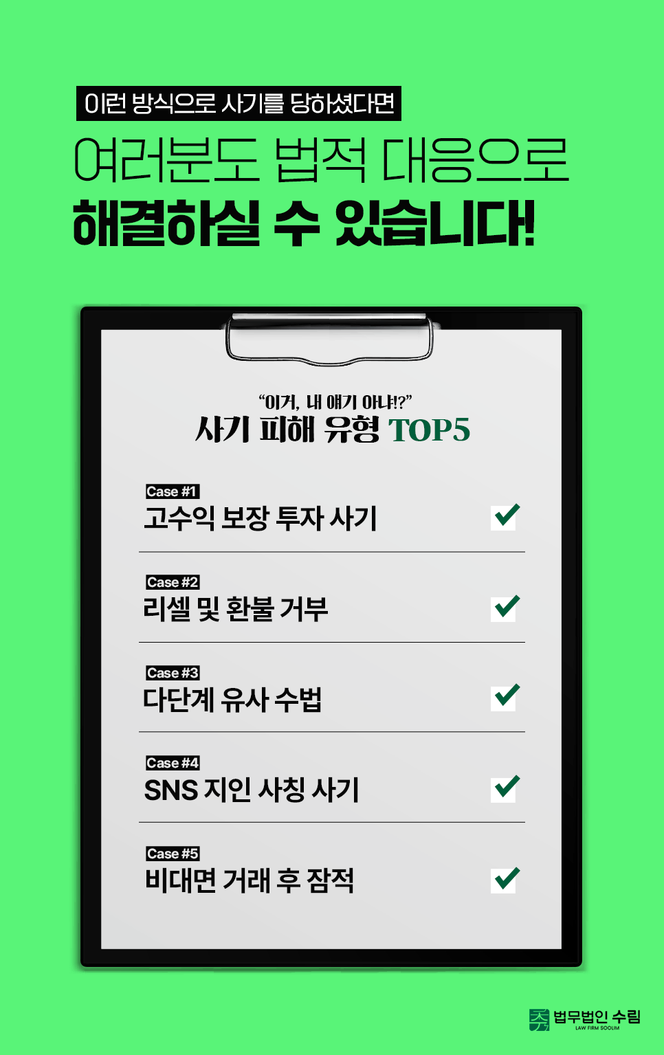 저희 법률사무소는 다수의 투자사기 사건을 직접 맡아 피해 회복 경험을 쌓아왔습니다. 혼자 고민하지 말고, 지금 바로 상담을 통해 해결 방법을 찾아보시기 바랍니다.